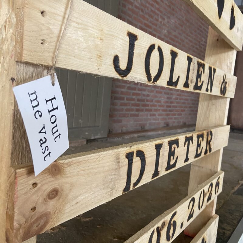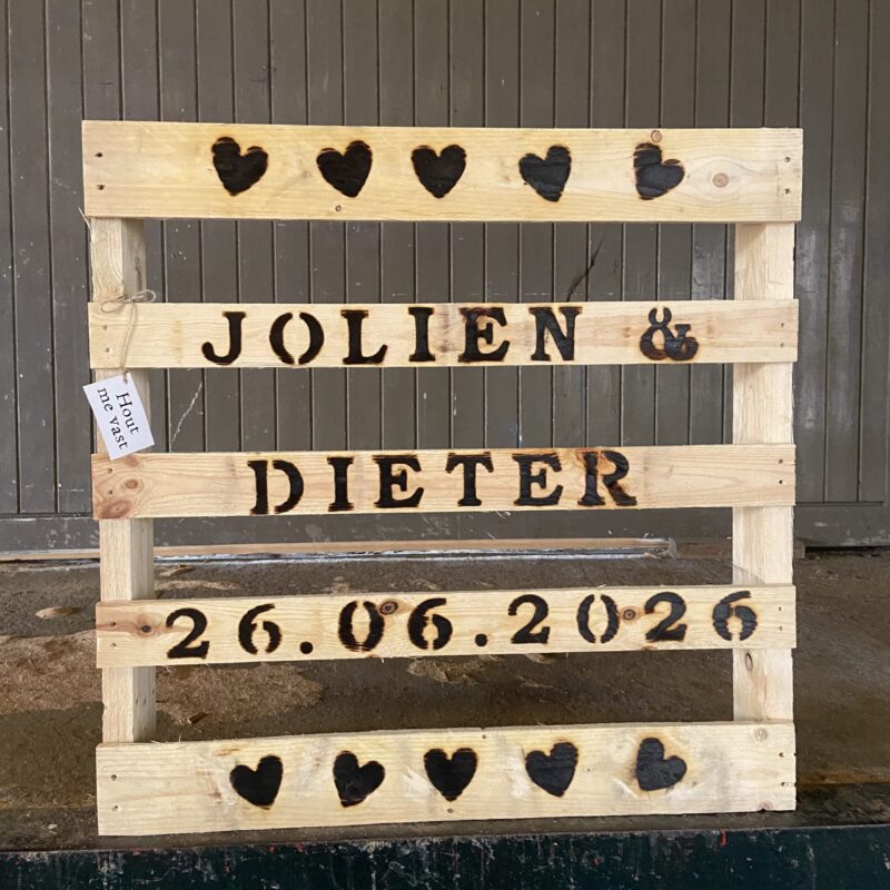 - Jouw tekst We branden de tekst in de pallet. We hebben alle letters (in hoofdletter), cijfers, &-teken, ☆-teken [ster], ♡-teken [hart], pijl links of rechts (met of zonder hartje). Het formaat van één letter / teken is ongeveer 6 x 6 cm.